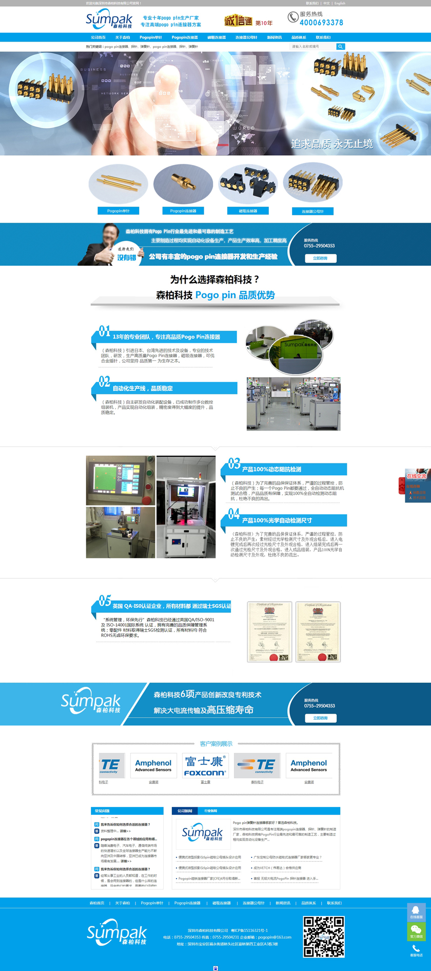 Project Description 深圳市森柏科技有限公司是专注高端pogo pin连接器、探针、弹簧针的制造厂家,森柏科技拥有Pogo Pin行业最先进和最可靠的制造工艺,主要制造过程均实现自动化设备生产,产品生产效率高,加工精度高,重要检测过程均采用自动化快速识别系统,大大降低了人为操作失误的风险,极大的提升了检测效率,工艺过程得到极大的改善和满足。因此产品质量和稳定性获得巨大突破。 Official website address 吴忠http://www.zgsumpak.com I want to share